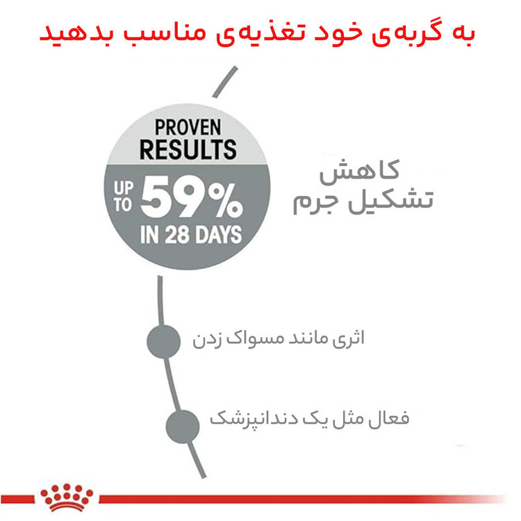 ROYAL CANIN© Dental Care اثر قابل تاییدی دارد: با یک رژیم غذایی انحصاری همراه با Dental Care به مدت 28 روز، تشکیل تارتار را می توان تا 59٪ کاهش داد.